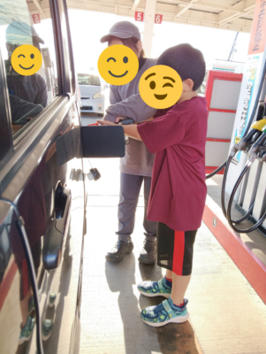 ・職員と一緒に給油を体験するなど、日常生活の中の動作に取り組んでいる様子です。